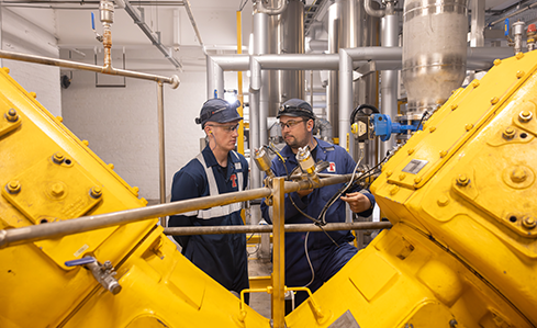 A Tennent's glasgowi sörfőzdéjében üzemelő CO₂ kompresszor állomás rutinellenőrzése, amely a nyers erjesztési gázt dolgozza fel és nyomja 18 bar-ra